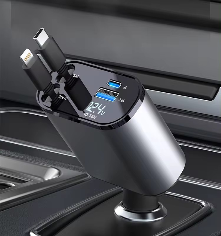 Fast Retractable Car Charger USB C Car Charger Fast Charge 60W 2 Retractable Cables and USB Port Car Charger Adapter